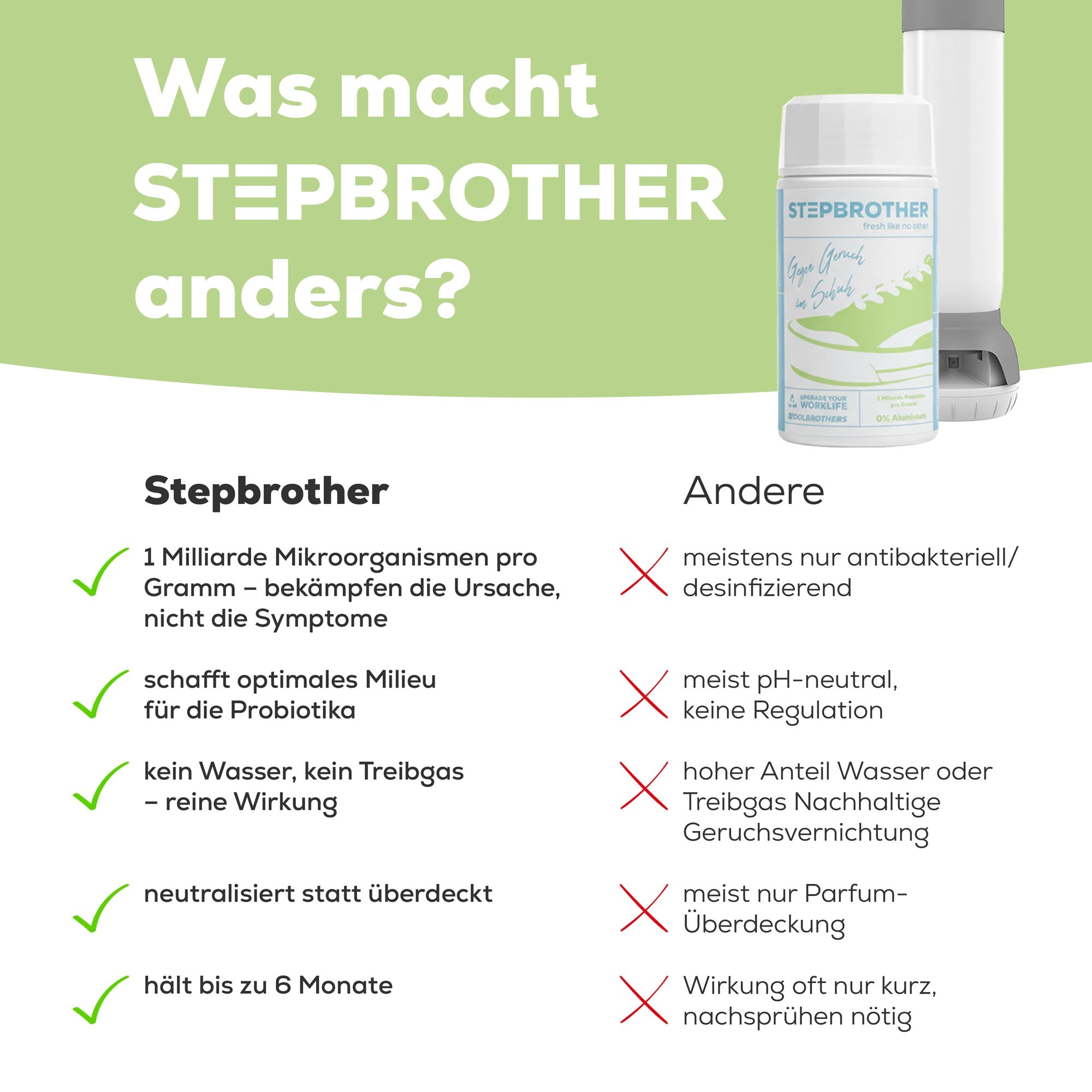 STEPBROTHER ist mehr als nur ein Schuhpulver. Es ist dein täglicher Begleiter für Frische und Komfort. Verabschiede dich von unangenehmen Gerüchen und genieße das Gefühl von trockenen, frischen Füßen, egal wie anspruchsvoll dein Tag ist. Probiere es aus und lass dich überzeugen!
