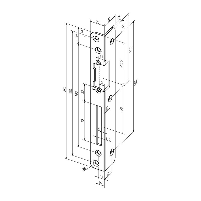 z wycięciem na zatrzask i rygiel - oznaczenia metrowe - grubość materiału 3 mm - z dodatkowym otworem mocującym - do popularnych modeli standardowych elektrozaczepów eff-eff z wyjątkiem wariantów ProFix®