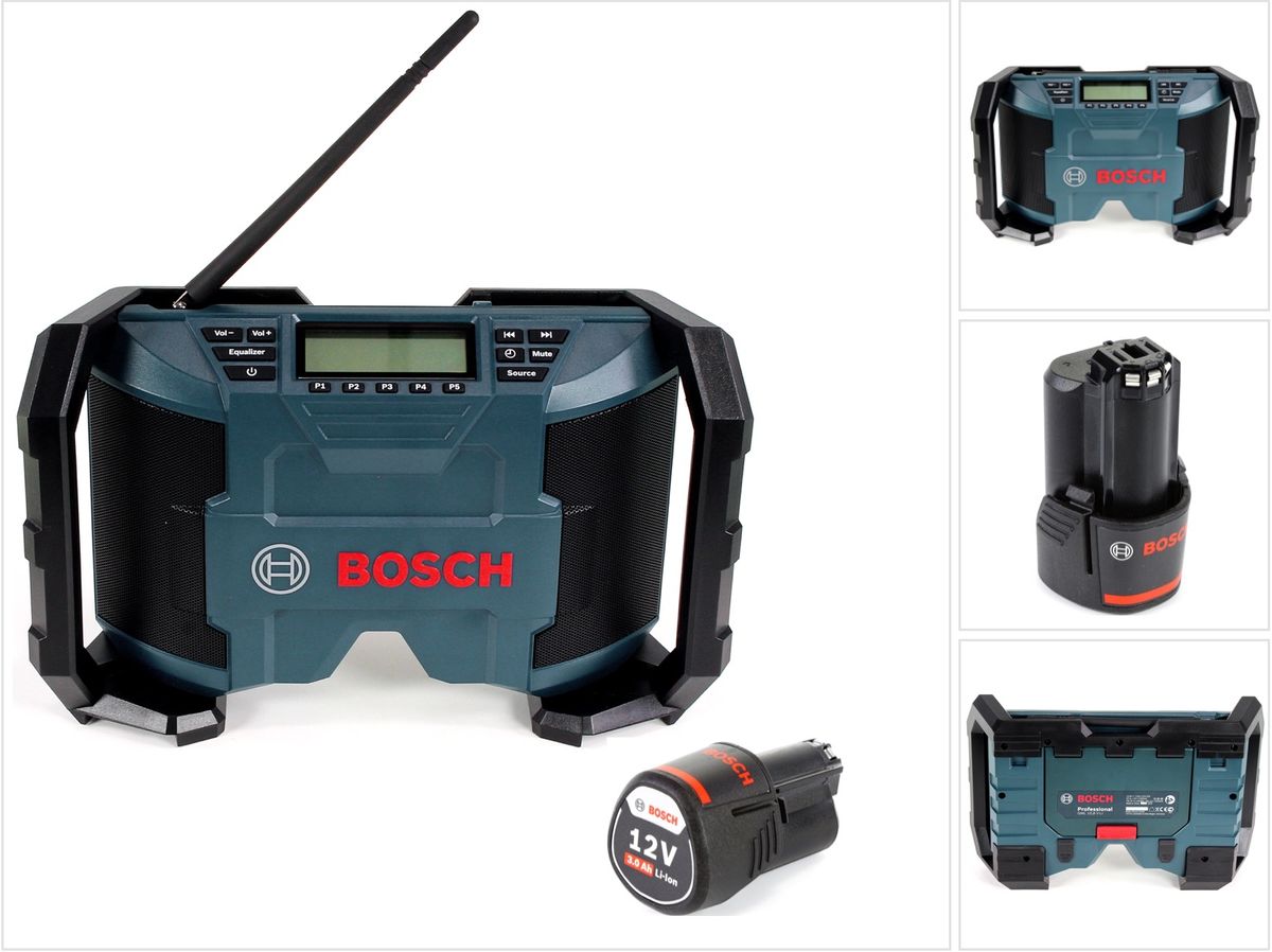 Der GML 10,8V überzeugt mit zwei 5 Watt Neodym-Lautsprecher für Top Sound bei der Wiedergabe von FM/AM & MP3-Dateien. Die vorteilhafte Größe lässt das Radio perfekt in eine halbe Bosch L-BOXX passen und ermöglicht einen einfachen Transport mit System. Es lassen ich durch die Radio-Senderspeicherplätze 10 Sender abspeichern. Über ein im Lieferumfang enthaltenen 3,5 mm Aux-In Kabel, wird ein Anschluss von externen Abspielgeräten wie Smartphone oder MP3-Player ermöglicht. Durch seine robuste Bauweise ist das Radio sehr widerstandsfähig, somit ist der Einsatz auf der Baustelle problemlos möglich. Zu dem Radio gehört der Bosch GBA 12V 3,0 Ah Akku, der zeichnet sich durch sein sehr geringes Gewicht und seine dennoch hohe Leistungsfähigkeit aus. Trotz der hohen Kapazität ist der Akku zudem sehr kompakt. Das flexible Bosch Power System garantiert ein universelles Einsetzen dieses Akkus in alle 12 V sowie 10,8 V Geräte von Bosch.