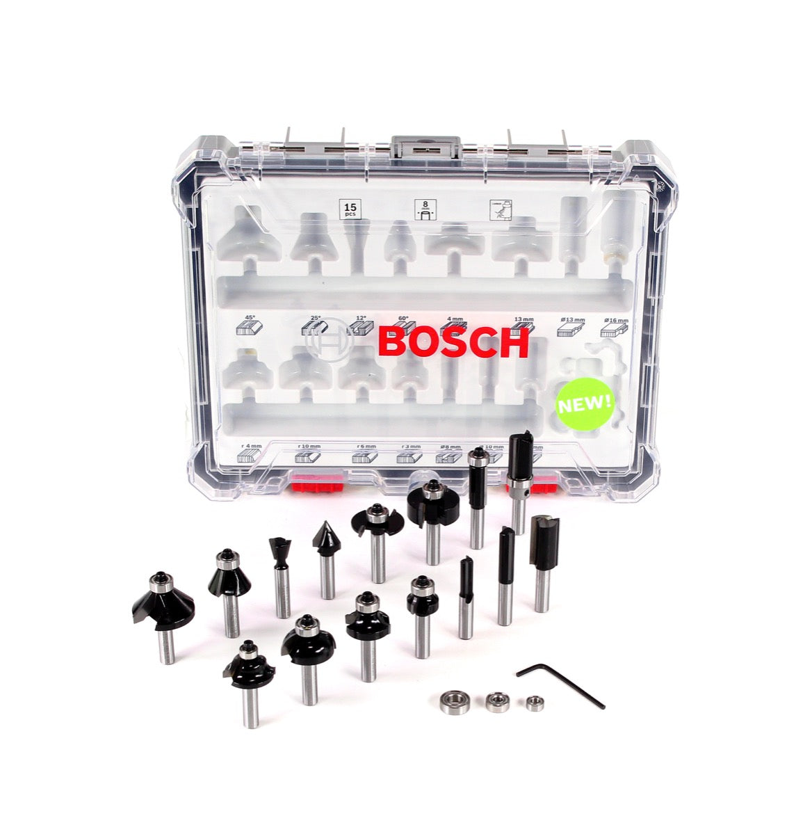 Das Bosch Mixed Fräser Set eignet sich für die Feinbearbeitung und ermöglicht diverse Anwendungen bei der Holzbearbeitung. Dank verschiedener Geometrien lassen sich mit dem Set eine Vielzahl von Profilen fräsen. Die Fräser eignen sich für die Bearbeitung von Weich- und Hartholz und Holzverbundstoffen. Die Hartmetallschneiden garantieren eine überdurchschnittlich lange Lebensdauer und präzise Arbeit. Zusammen mit der Kombifräse wird das Bosch Mixed Fräser Set im Kunststoffkoffer angeboten, das sich für die Feinbearbeitung und ermöglicht diverse Anwendungen bei der Holzbearbeitung eignet. Dank verschiedener Geometrien lassen sich mit dem Set eine Vielzahl von Profilen fräsen. Die Fräser eignen sich für die Bearbeitung von Weich- und Hartholz und Holzverbundstoffen. Die Hartmetallschneiden garantieren eine überdurchschnittlich lange Lebensdauer und präzise Arbeit. Das Set bestehet aus den folgenden Teilen: 1x Bosch Bündigfräser, 1x Bosch Bündig-Profilfräser, 1x Bosch Zinkenfräser, 2x Bosch Fasefräser, 1x Bosch V-Nutfräser, 1x Bosch Scheibenfräser, 1x Bosch Falzfräser, 1x Bosch Römerprofilfräser, 1x Bosch Kehlfräser, 2x Bosch Abrundfräser, 2x Bosch 2-schneidiger Nutfräser, 1x Bosch 3-schneidiger Nutfräser, 3x Kugellager, 1x Imbusschlüsse.