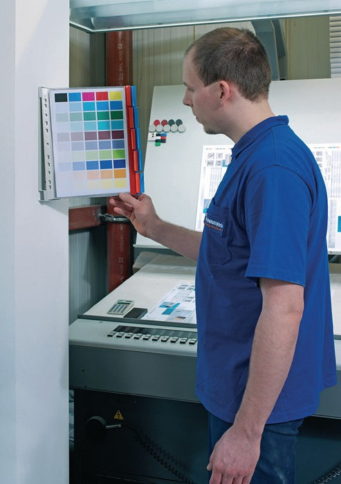 Komplett-Set · mit Hartfolie · Metall-Wandhalter zur Montage an Wänden oder Lochwänden (inkl. Montagematerial) · mit 10 Sichttafeln (je 5 in rot und blau) · inkl. Kunststoffreiter und Beschriftungsetiketten · Aneinanderreihen der Wandhalter in beliebiger Anzahl möglich