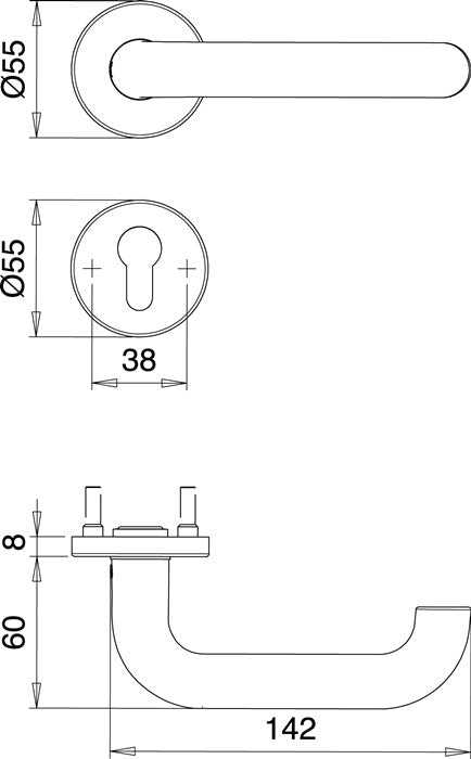 Kombi-Schutzgarnitur mit Rosettenverschraubung · Grundkonstruktion: innen = Stahl, außen = Druckguss, bei Ausführung mit ZA = massives Aluminium · Ausführung Innenrosetten: Ø 55 mm, Stärke 8 mm · Drücker-Lagerung: lose · Drückertyp und -stärke: 103 mit Ø 22 mm · Knopfausführung: K2 (gekröpft) · Stütznocken: M5, Ø 8 mm · Verschraubung: 4-fach M5, verdeckt · Spezialrollenwechselstift mit M12-Gewinde · Widerstandsklasse ES1 · Modell 8722 = Außenschild mit Anbohrschutz und Zylinderabdeckung: federnd gelagert für 11 - 14 mm Überstand · Entfernung 72 mm · DIN links / rechts · Vierkant 8 mm · Wechselgarnitur