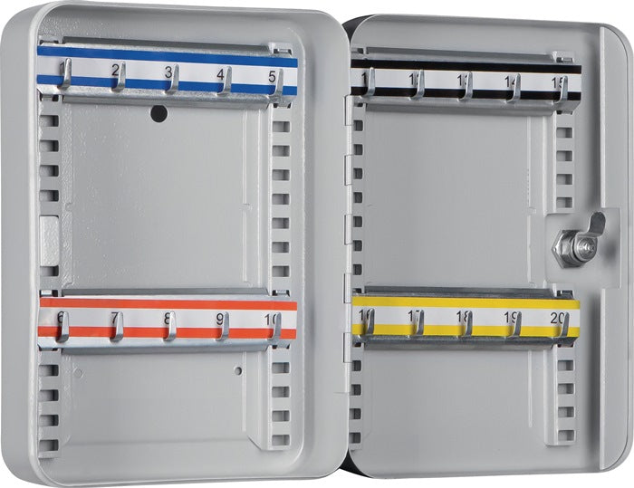 mit Zylinderschloss und 2 Schlüsseln · aus Stahlblech · lichtgrau (RAL 7035) · zur übersichtlichen Aufbewahrung von Schlüsseln · Wandmontage über Rückwandbohrungen möglich · auch in einem Möbel/Schrank montierbar · Hakenleisten sind im Raster höhenverstellbar
