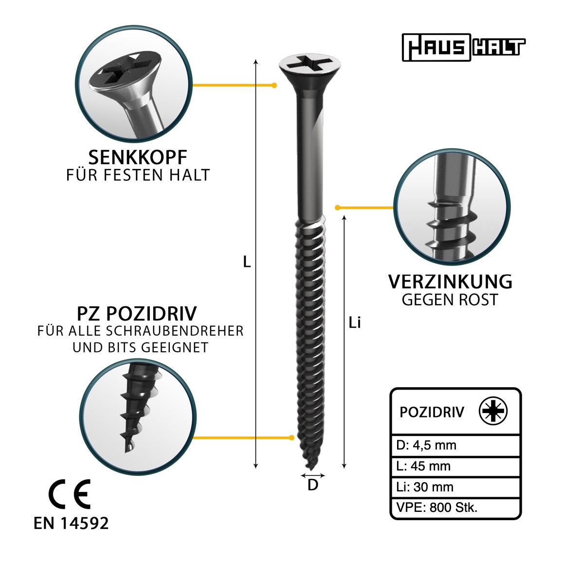 HausHalt uniwersalny wkręt budowlany do drewna 4,5 x 45 mm PZ2 800 szt. ( 2x 000051371170 ) srebrny ocynkowany wgłębienie krzyżowe Pozidriv łeb stożkowy gwint częściowy