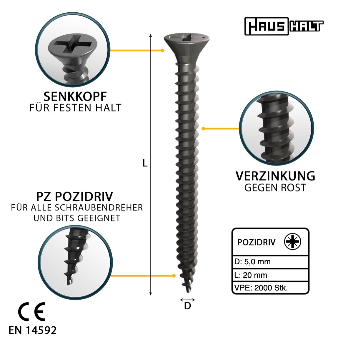 HausHalt uniwersalny wkręt budowlany do drewna 5.0 x 20 mm PZ2 2000 szt. ( 4x 000051371187 ) srebrny ocynkowany wgłębienie krzyżowe Pozidriv łeb stożkowy pełny gwint