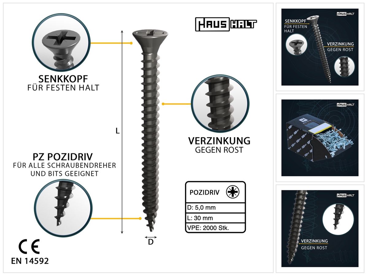 HausHalt uniwersalny wkręt budowlany do drewna 5.0 x 30 mm PZ2 2000 szt. ( 4x 000051371189 ) srebrny ocynkowany wgłębienie krzyżowe Pozidriv łeb stożkowy pełny gwint