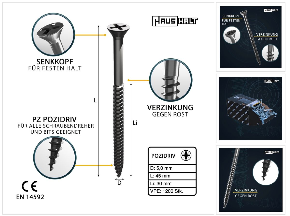 HausHalt uniwersalny wkręt budowlany do drewna 5.0 x 45 mm PZ2 1200 szt. ( 4x 000051371196 ) srebrny ocynkowany wgłębienie krzyżowe Pozidriv łeb stożkowy gwint częściowy