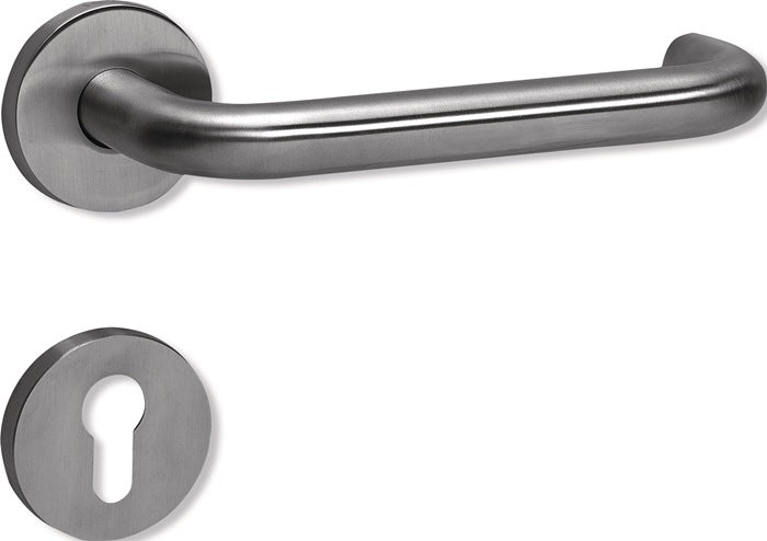 Zimmergarnitur · in H-Technik nach DIN 18255 und DIN EN 1906 aus Edelstahl, Oberfläche matt geschliffen, bestehend aus: Türdrücker 112XAH, Durchmesser 21,3 mm, Rundrosetten 305.21XAH und 306.23XA, mit integriertem Hochhaltemodul mit Federunterstützung · der Drücker erfüllt die Vorgaben der DIN EN 179 und DIN 18040 · Gebrauchskategorie: Klasse 4 Garnitur mit Vierkantstift 8 - 8,5 mm · Ausführungsvorschlag! Bitte alle Maße und baulichen Gegebenheiten im Auftragsfall prüfen!