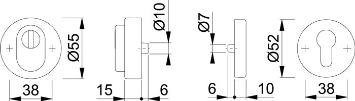 Para rozet na klucz ochronny ze stali nierdzewnej do drzwi zewnętrznych - Konstrukcja nośna: Zamak na zewnątrz, stal wewnątrz, krzywki nośne - Mocowanie: ukryte, ciągłe, śruby gwintowane M5 - Grubość 15 mm - Ø 55 mm - Perforacja PZ - do drzwi o grubości 57-62 mm + 67-72 mm Wersja z osłoną wkładki: stalowa, do wkładki wystającej na długość 10-18 mm