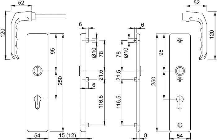 Zestaw klamek do drzwi końcowych - z częściową wkładką stalową jako zabezpieczenie przed przewierceniem - wysokość krawędzi szyldu gałki: 12 mm - z potrójnym widocznym mocowaniem śrubowym - z krzywkami stalowymi - perforacja PZ - DIN lewy / prawy - klasa odporności ES 0