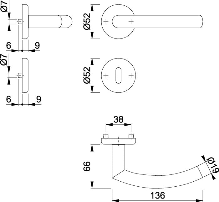 Zestaw rozet do drzwi wewnętrznych - Klamki z połączeniem trzpienia profilowego (kwadrat 8 mm) do drzwi o grubości 38-42 mm i sprężyną powrotną - Rozety z krzywkami podpierającymi niewidocznie przykręcone - DIN lewy / prawy