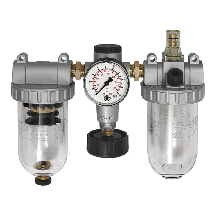 Standardowy - trzyczęściowy, składający się z niezależnego od ciśnienia zwrotnego membranowego regulatora ciśnienia z wtórnym odpowietrzaniem, separatora odśrodkowego i proporcjonalnej olejarki - ze zbiornikiem z poliwęglanu - gwint wewnętrzny