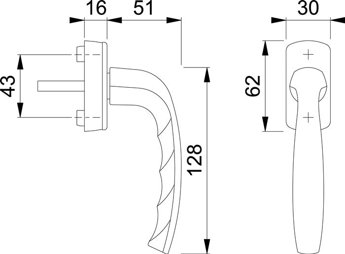 Klamka okienna Secustik® testowana zgodnie z RAL-RG 607/9 - spełnia wymagania AhS RAL-RG 607/13 - sprężynowa, obrotowa zaślepka - rozeta z tworzywa sztucznego z krzywkami podpierającymi - solidny trzpień 7 mm - zmiana długości 10 mm (32-42 mm) - zatrzask boczny z precyzyjną pozycją zatrzasku - automatyczna blokada zapobiegająca nieuprawnionemu ruchowi okucia okiennego i przekręceniu kwadratowego trzpienia od zewnątrz - w komplecie śruby M5x45 mm i M5x50 mm