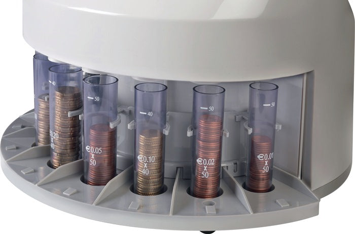 szybkie i łatwe liczenie i sortowanie monet euro - duży zasobnik może pomieścić do 500 monet i liczy z prędkością do 220 monet na minutę - wsyp wszystkie monety do zasobnika - nie jest wymagane wcześniejsze sortowanie - i naciśnij start