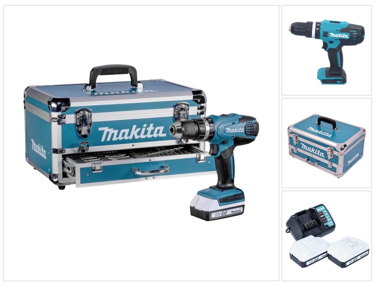 Makita HP 488 D009 Akku Schlagbohrschrauber 18 V 42 Nm G-Serie + 2x Akku 1,5 Ah + Ladegerät + 70 tlg. Zubehörset + Koffer