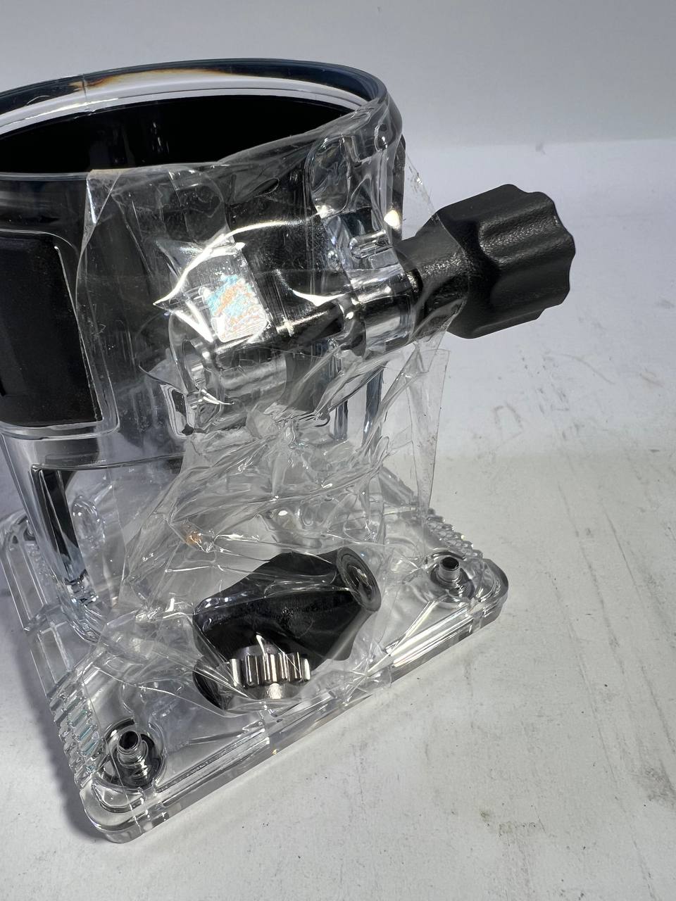 Das transparente Kantenfräsenmodul (Artikelnummer 199089-46, 8 mm) ist ideal für die Multifunktionsfräsen DRT50/RT0700C. Es bietet eine gummierter Grifffläche für sicheren Halt, eine große Öffnung für klare Sicht auf den Fräser, präzise Tiefeneinstellung und eine zuverlässige Arretierung. Es eignet sich hervorragend für detaillierte Fräsarbeiten.