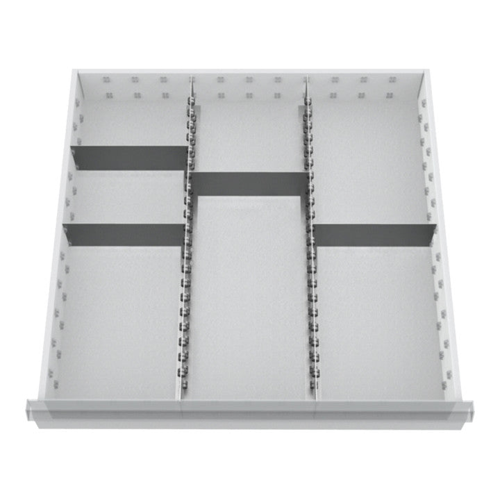 Metalowa przegroda do frontu o wysokości 200 mm - do szuflady wewnętrznej o wymiarach szer. 600 x gł. 600 mm - 2 przegrody wzdłużne - 4 przegrody poprzeczne