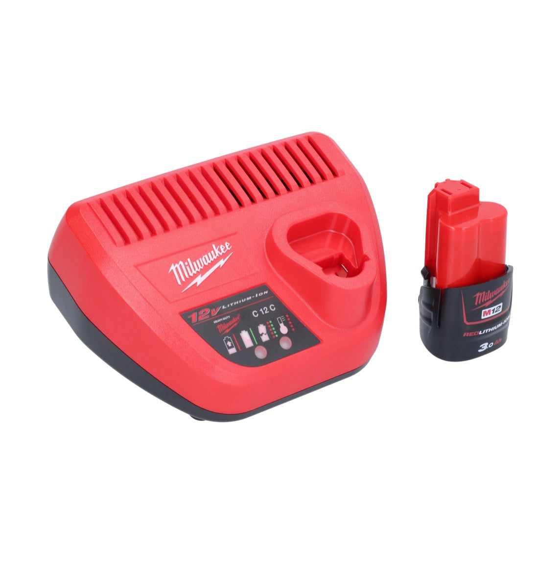 - 1x akumulator Milwaukee M12 B3 3,0 Ah