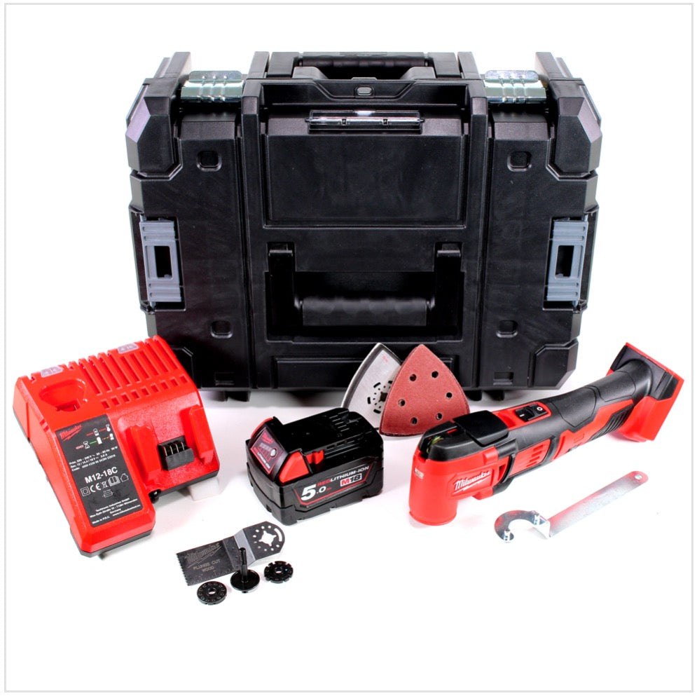 Milwaukee M18 BMT - 501 18 V Akku Multi Funktion Werkzeug in Stanley Box + M18 B5 5,0 Ah Akku + M12-18C Ladegerät