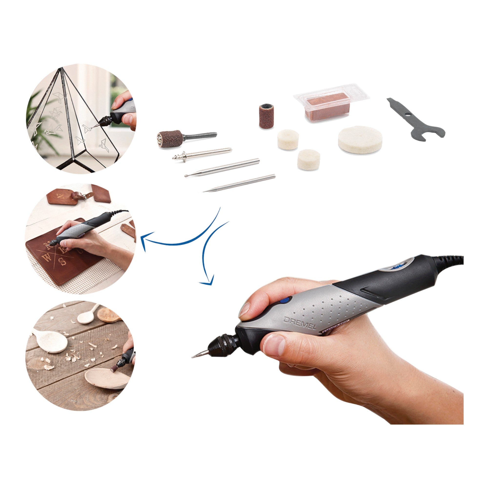 Narzędzie wielofunkcyjne Dremel Stylo+ łączy w sobie poręczną konstrukcję z wszechstronnymi możliwościami zastosowania, a dzięki lekkiej konstrukcji jest tak ukształtowane, że mieści się w dłoni jak zwykły długopis i umożliwia wyjątkowo precyzyjną pracę. Narzędzie jest idealne do grawerowania, lekkiego szlifowania i polerowania powierzchni i otwiera wiele kreatywnych możliwości w szerokim zakresie projektów. Prędkość obrotowa jest regulowana w zakresie od 5000 do 22000 obrotów na minutę, dzięki czemu można ją precyzyjnie dostosować do wymagań obrabianego przedmiotu, czy to szkła, czy drewna, zapewniając wysoką precyzję i czyste rezultaty. Dzięki dużemu, dwumetrowemu kablowi urządzenie oferuje dużą swobodę ruchu i umożliwia nieograniczoną pracę w dowolnym miejscu, a zasilanie za pomocą kabla zapewnia stałą wydajność bez przerw spowodowanych ładowaniem. Beznarzędziowy uchwyt umożliwia szybką i łatwą wymianę akcesoriów, zapewniając płynne przejście między różnymi etapami pracy. Zestaw Stylo+ 2050-15 zawiera wszechstronny wybór 15 akcesoriów, obejmujący szeroki zakres zastosowań, od szlifowania i polerowania po najdrobniejsze prace grawerskie, dzięki czemu narzędzie to jest idealne zarówno do szczegółowych prac rzemieślniczych, jak i kreatywnych projektów DIY, oferując połączenie intuicyjnej obsługi, precyzji i elastyczności.