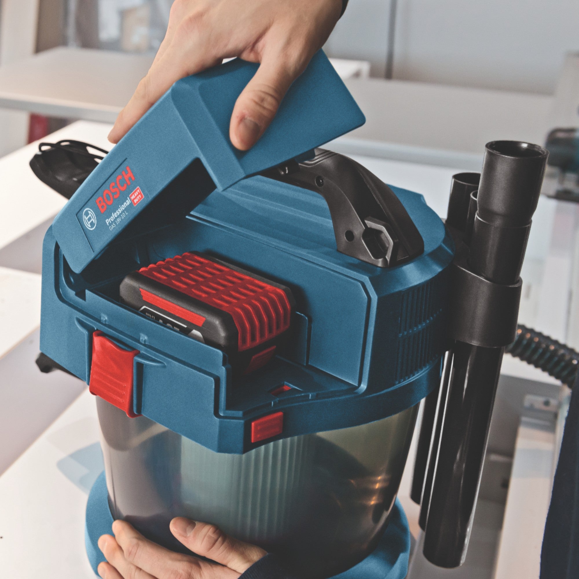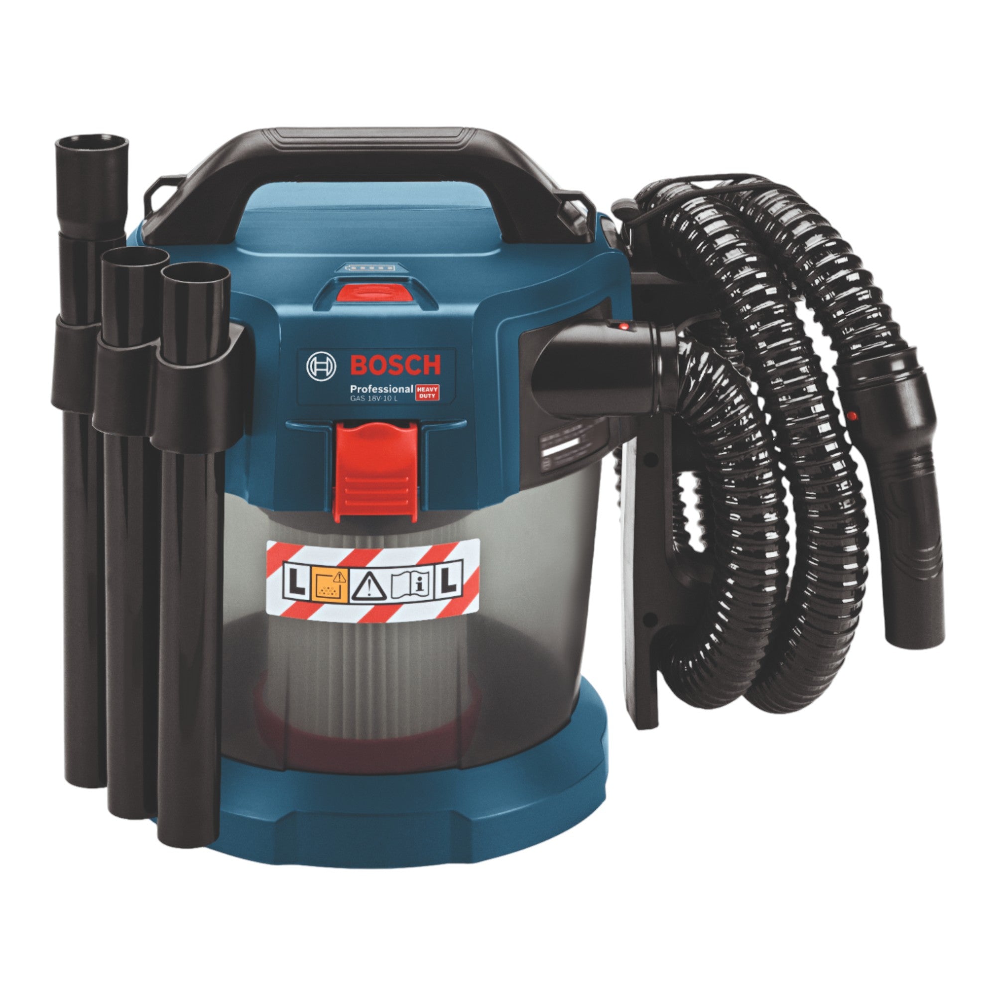 Odkurzacz akumulatorowy Bosch GAS 18V-10 L Professional to kompaktowy i wydajny odkurzacz 18 V w klasie pyłu L, który dzięki bezworkowej konstrukcji i szerokiej gamie akcesoriów idealnie nadaje się do wszechstronnych zastosowań na mokro i na sucho. Innowacyjna technologia obrotowego przepływu powietrza skutecznie zapobiega zatykaniu się filtra, a tym samym zapewnia stałą, nieprzerwaną moc ssania. Dzięki niewielkiej wadze i kompaktowej konstrukcji odkurzacz jest wyjątkowo łatwy w transporcie i przechowywaniu, co pozwala zaoszczędzić miejsce. Odkurzacz GAS 18V-10 L jest wyposażony w filtr HEPA, który spełnia wymagania klasy pyłu L UE i jest w pełni kompatybilny z systemem Bosch Click & Clean oraz wszystkimi akumulatorami i ładowarkami Bosch Professional 18V z systemu Professional 18V. Jest również częścią sojuszu akumulatorowego AMPShare, co oznacza, że może być używany we wszystkich markach.