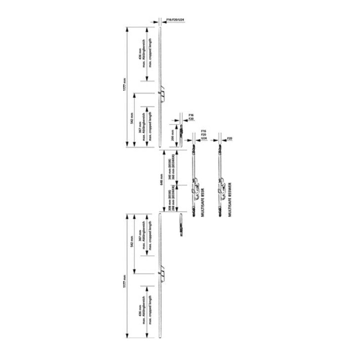 1 zatrzask śrubowy - długość 1177 mm - zakres cięcia: środek nakrętki do śruby na dole = 850-650 mm, na górze 730-515 mm