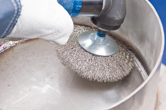 do średnio ciężkich prac szczotkarskich, takich jak usuwanie zadziorów, czyszczenie i odrdzewianie stali nierdzewnej (INOX) - INOX trim blue do stosowania na wszystkich stalach nierdzewnych (INOX), takich jak V4A. Drut ze stali nierdzewnej (INOX) wytrzymuje temperatury do 450 °C. Trzpień Ø 6 mm