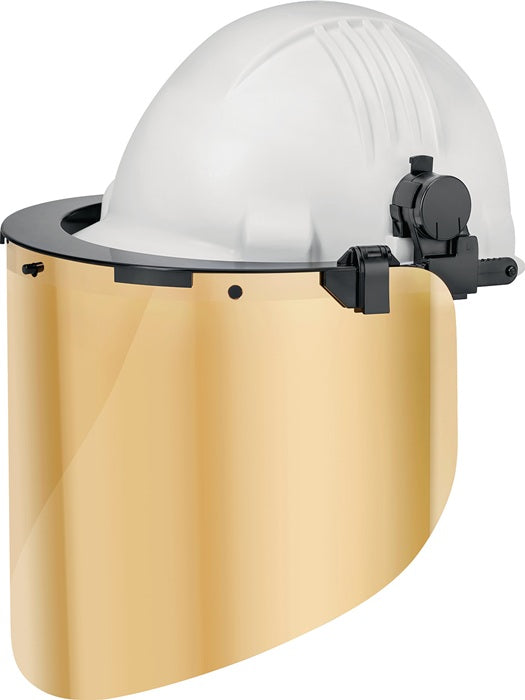 wykonane z poliwęglanu - mocowanie do kasku za pomocą otworów 30 mm - pasują do wielu popularnych przemysłowych kasków ochronnych - daszek ochronny można złożyć za pomocą 4-punktowego połączenia zapadkowego - 240 x 250 x 70 mm