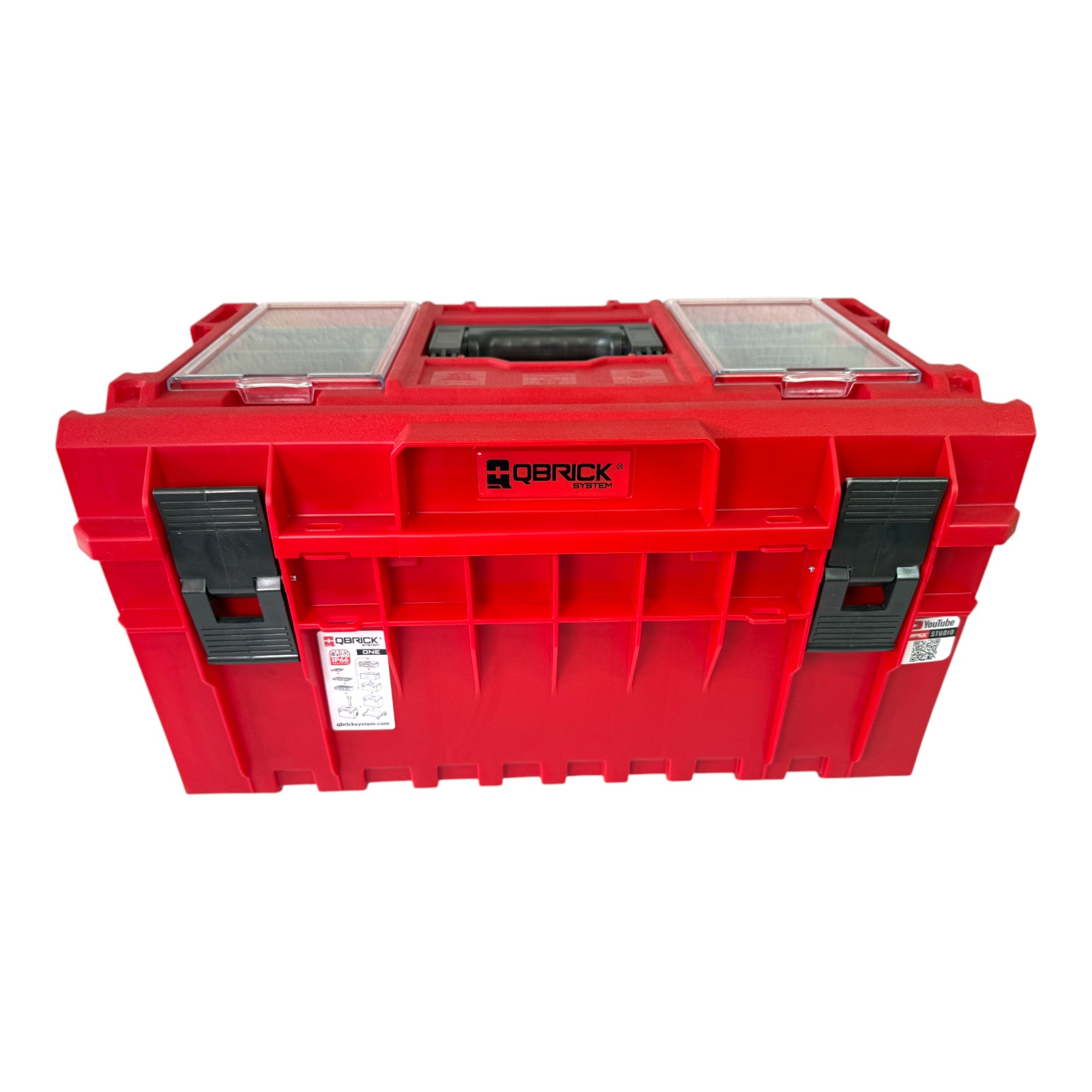 ONE 350 to duża walizka narzędziowa o pojemności 38 litrów. Dzięki temu jest w stanie pomieścić duże elektronarzędzia i narzędzia ręczne. Każda skrzynka wyposażona jest w elastyczną uszczelkę, która zapewnia pełną ochronę przed wnikaniem pyłu i wody (IP66). Wyposażona jest w dwie regulowane przegrody - normalną i drugą wielokomorową, która ułatwia organizację wnętrza skrzynki dzięki zróżnicowanym uchwytom na narzędzia ręczne. Wyjmowana komora wielokomorowa może być używana jako samodzielny pojemnik na narzędzia. Profesjonalna pokrywa jest standardowo wyposażona w dwa przestronne organizery z ruchomymi przegrodami i odpornymi na uderzenia suwakami z poliwęglanu. Wzmocniona konstrukcja pokrywy i korpusu gwarantuje wysoką nośność (50 kg) i może wytrzymać nacisk do 120 kg, tworząc wygodne platformy robocze. RED ULTRA HD to specjalna edycja produktów Qbrick System ONE wykonanych z ultrawytrzymałego tworzywa sztucznego, które charakteryzuje się wyjątkową odpornością na uszkodzenia mechaniczne. Przeprowadzone testy udarności potwierdzają jego wyjątkową trwałość, nawet w warunkach poniżej 0°C. Wersja 2.0 Custom to nowa generacja skrzynek narzędziowych i organizerów o wzmocnionej konstrukcji. Gwintowane wkładki M8 w obudowach umożliwiają dostosowanie systemu do potrzeb użytkownika.#letscustomise