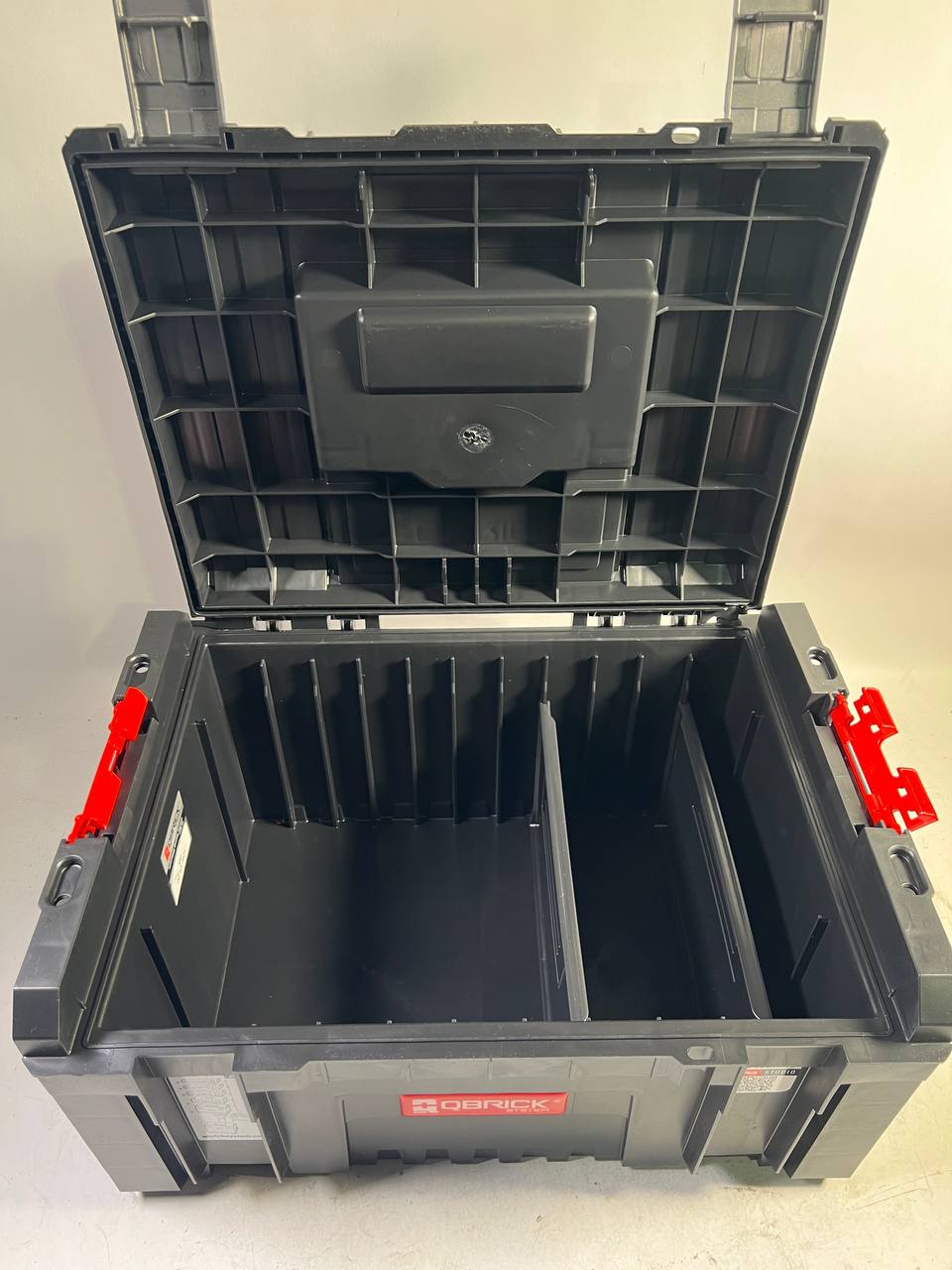 Qbrick System PRO Toolbox to pojemna, modułowa skrzynka narzędziowa, która już w standardzie oferuje szeroką gamę akcesoriów: elastyczną uszczelkę zintegrowaną z pokrywą, która zapewnia wysoką odporność na wnikanie pyłu i wody, 3 regulowane przegrody, przestronną półkę oraz boczne elementy łączące i mocujące z przodu wykonane z super wytrzymałego poliamidu. Specjalne prowadnice w skrzynce narzędziowej QS PRO umożliwiają umieszczenie w niej organizera QS TWO Multi Organiser, który służy do przechowywania drobnych akcesoriów warsztatowych.