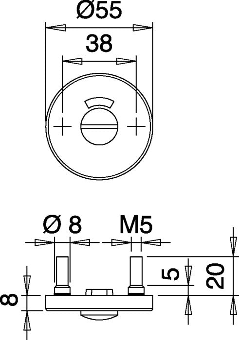 okrągła - na konstrukcji stalowej - wykonana ze stali nierdzewnej - rozeta Ø 55 mm - grubość rozety 8 mm - rozstaw krzywek 38 mm - niewidoczne połączenie śrubowe - do drzwi o grubości 40-65 mm - WC do drzwi o grubości 40-48 mm