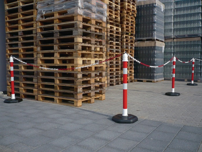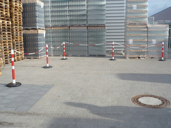 z sześciokątną podstawą - polipropylen węglanowy - słupek Ø 63 x wys. 1000 mm - podstawa 370 x 75 mm - szybkie połączenie podstawy ze słupkiem za pomocą zamka bagnetowego - czerwony słupek z 2 białymi paskami odblaskowymi - z oczkiem na głowicy słupka