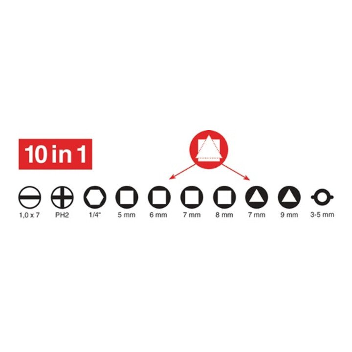 Do wszystkich standardowych systemów odcinających dopływ gazu, wody i energii elektrycznej, a także do systemów technicznych w budynkach, takich jak systemy klimatyzacji i wentylacji, zawory odcinające, rozdzielnice sieciowe itp. - Łańcuch mocujący z plastikowym adapterem 6,3 mm (1/4″) - Materiał: odlew cynkowy - Wymiary: 72 x 72 mm - Funkcje: 1. gniazdo kwadratowe 5 mm 2. gniazdo kwadratowe 6 mm 3. gniazdo kwadratowe 7 - 8 mm 4. gniazdo kwadratowe 7 mm 5. gniazdo kwadratowe 9 mm 6. podwójny bit 3 - 5 mm 7/8. PH rozmiar 2 / gniazdo 7 mm i plastikowy adapter do bitów 6,3 mm (1/4 ")