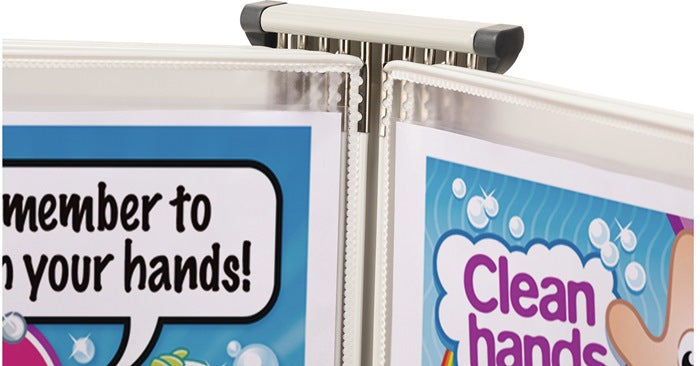 Komplett-Set · Wandhalterung Stahlblech lichtgrau RAL 7035 · mit 10 antimikrobiellen Sichttafeln DIN A4 aus strapazierfähigem, flexiblem PVC, mit kunststoffummanteltem Stahldraht · Öffnung oben · mit 5 Aufsteckreitern 50 mm · mit 4 Pluggers (Anschlagendstücke) für einen idealen Lesewinkel · Aneinanderreihen der Wandelemente in beliebiger Anzahl möglich · inkl. Befestigungsmaterial