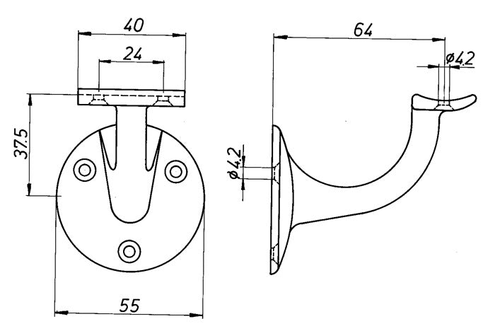 zakrzywiony wspornik - odległość od ściany 64 mm - płyta ścienna 53 Ø - z wpuszczanymi otworami na śruby