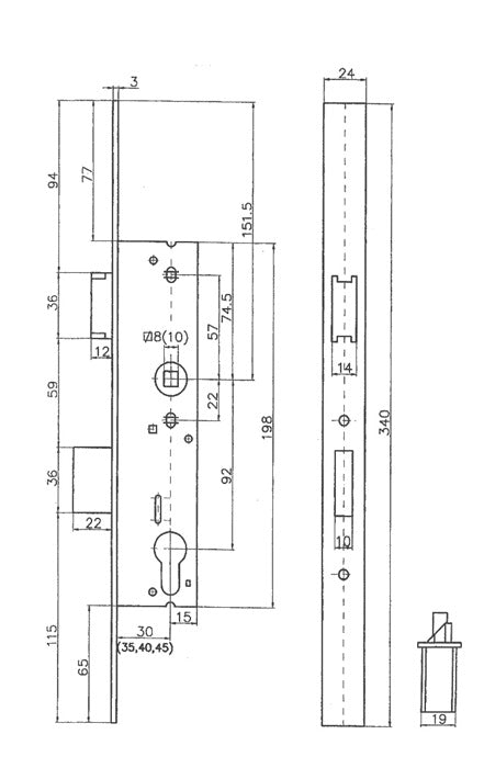 Zamek wpuszczany ramowy Bever ( 3000251216 ) PZW 24/35/92/10 mm DIN rygiel lewy/prawy wyrzut 22 mm 340 mm