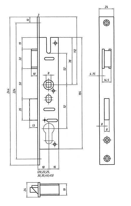 Zamek wpuszczany ramowy Bever ( 3322099051 ) PZW 24/30/72/8 mm DIN rygiel lewy/prawy wysuw 11 mm 244 mm