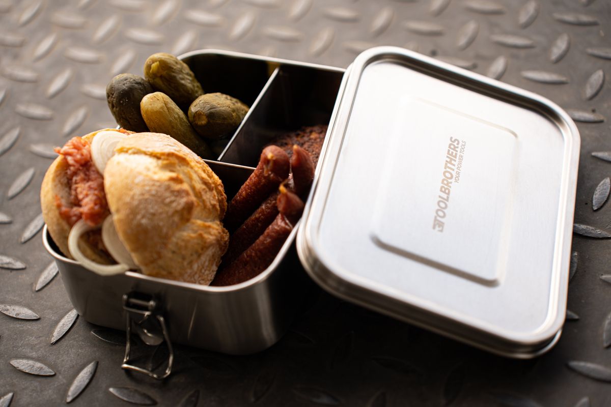 - 1x pojemnik na lunch Toolbrothers Fan ze stali nierdzewnej z 2 półkami i pokrywką ze stali nierdzewnej 1340 ml