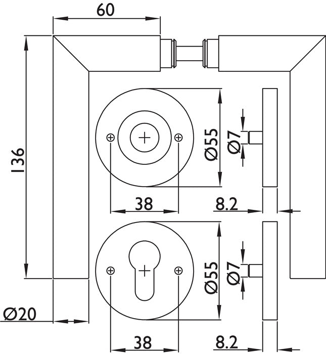 wraz z materiałem mocującym, odpowiedni do grubości drzwi: PZ / PZW = 40-58 mm, ze sprężyną powrotną - trzpień kwadratowy 9 mm Nie nadaje się do drzwi ewakuacyjnych!