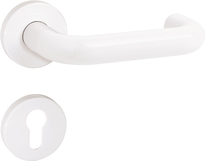 w technologii R z różami wg DIN 18255 i DIN EN 1906 z poliamidu, powierzchnia o wysokim połysku, składający się z: klamka w kształcie litery U wykonana z poliamidu z ciągłym stalowym rdzeniem aż do końca klamki, kolorowa na całej długości, średnica 23 mm, z prowadnicą zaczepu i rowkiem zatrzaskowym, montaż poprzez proste zatrzaśnięcie klamki w dolnych częściach wstępnie zamontowanych na drzwiach. Mechanizm zatrzaskowy można ponownie zwolnić za pomocą klucza do demontażu. Klamka spełnia wymagania norm DIN EN 179 i DIN 18040. Konstrukcja nośna z tworzywa sztucznego i stali nierdzewnej, może być stosowana w wersji DIN lewej i DIN prawej. Stałe łożysko obrotowe rękojeści dźwigni z automatycznie załączającą się blokadą dookoła i punktem łożyskowym 5 mm jako bezobsługowe łożysko ślizgowe z elastycznym obszarem kompensacji i drugim punktem łożyskowym w szyjce rękojeści dźwigni. Ukryte, zabezpieczone przed poluzowaniem mocowanie śrubowe z kombinacją śruby M4 i tulei oraz kołkiem podpierającym. Zaślepka różana, okrągła, wykonana z poliamidu, kolorowa na całej powierzchni, średnica 55 mm, wysokość 13 mm, zakrzywiona, grubość ścianki 1,5 mm. Perforacja PZ Zaprojektowany i przetestowany dla sektora kontraktowego, kategoria użytkownika zgodnie z normą DIN EN 1906 - Klasa 4 Zestaw przeciwpożarowy z trzpieniem kwadratowym 9 mm, zgodnie z normą DIN 18273 - Zestaw dźwigni - Długość dźwigni 150 mm