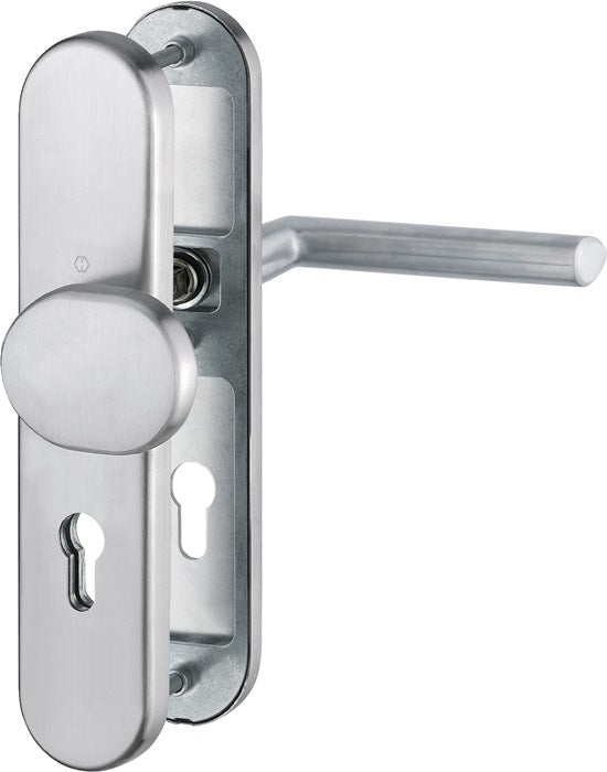 do zewnętrznych i płaskich drzwi wejściowych - testowane zgodnie z DIN 18257, DIN EN 1906 i DIN 18273 - klamka z łożyskiem stałym/obrotowym - (kategoria użytkowania 4) - bezobsługowe łożysko ślizgowe - połączenie trzpieniowe o pełnym profilu - konstrukcja nośna: stal na zewnątrz, zamak/stal wewnątrz wraz z krzywkami podpierającymi - ukryte, ciągłe mocowanie - perforacja PZ - kwadrat 9 mm - może być stosowany DIN lewy/prawy - rozstaw 72 mm