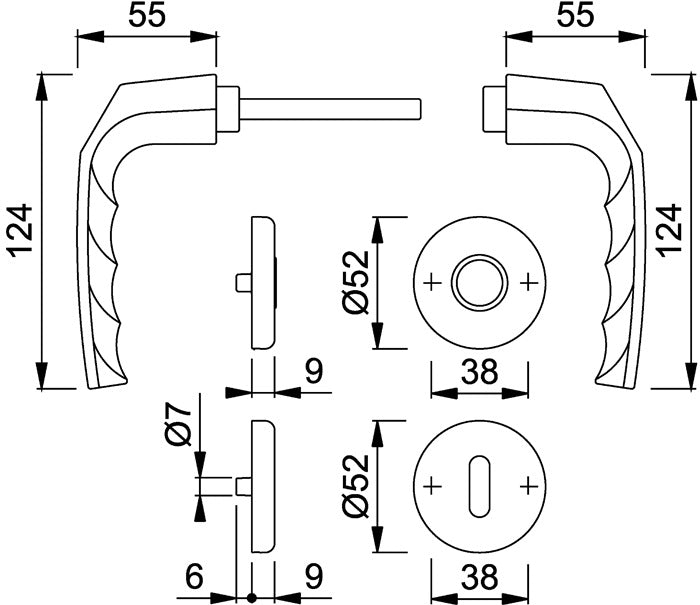 Zestaw rozet do drzwi wewnętrznych - podkonstrukcja z PVC-U z krzywkami podpierającymi - połączenie trzpieniowe profilu - ukryte, ciągłe mocowanie śrubowe z samogwintującymi śrubami gwintowanymi - zestaw klamek - kierunek zatrzymania DIN lewy / prawy