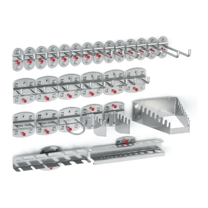 28-częściowy zakres dostawy: 6 uchwytów na narzędzia z końcówką kątową, 8 uchwytów na narzędzia z końcówką pionową, 6 podwójnych uchwytów na narzędzia, 2 uchwyty na szczypce, 1 uchwyt na maszynę, 1 uchwyt na klucz, 1 uchwyt na śrubokręt, 1 uchwyt na wiertarkę, 2 uchwyty na piłę