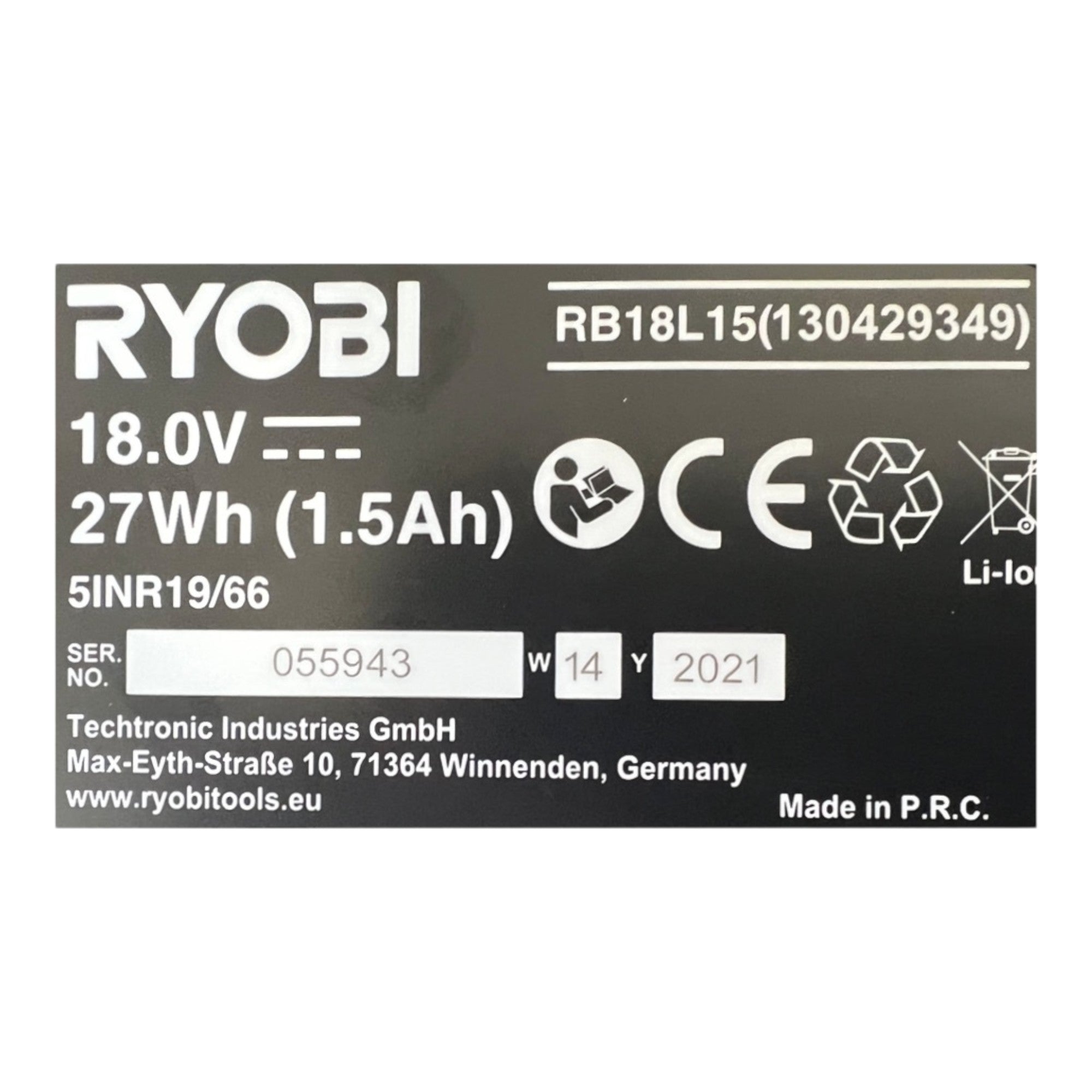 - 1x akumulator Ryobi RB18L15 18 V 1,5 Ah / 1500 mAh Li-Ion ONE+