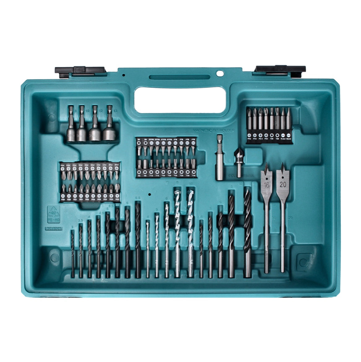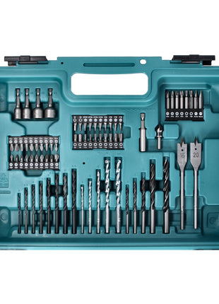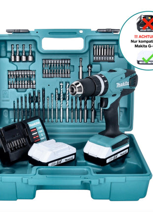 Akumulatorowa wiertarko-wkrętarka udarowa Makita HP 457 DWE10 18 V 42 Nm seria G + 2x akumulator 1,5 Ah + ładowarka + 74-częściowy zestaw wierteł + walizka