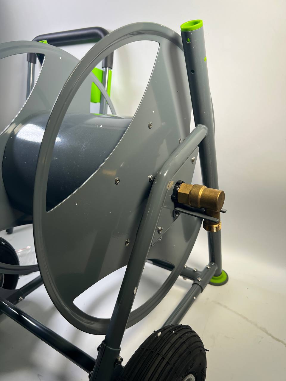 wysokiej jakości, malowana proszkowo i stabilna konstrukcja stalowa - antypoślizgowe opony pneumatyczne - miękki uchwyt i kątowe mosiężne złącze obrotowe - wyposażony w 25 m wąż Geka 110 1/2″ (13 mm), oryginalny system złączy Geka plus, dyszę natryskową i 1,5 m zestaw przyłączeniowy do kranu - w tym złącze kranowe G 3/4″ - wstępnie zmontowany - zakres temperatur węża: -10 °C do +50 °C - zakres temperatur wózka na wąż: +4 do +60 °C