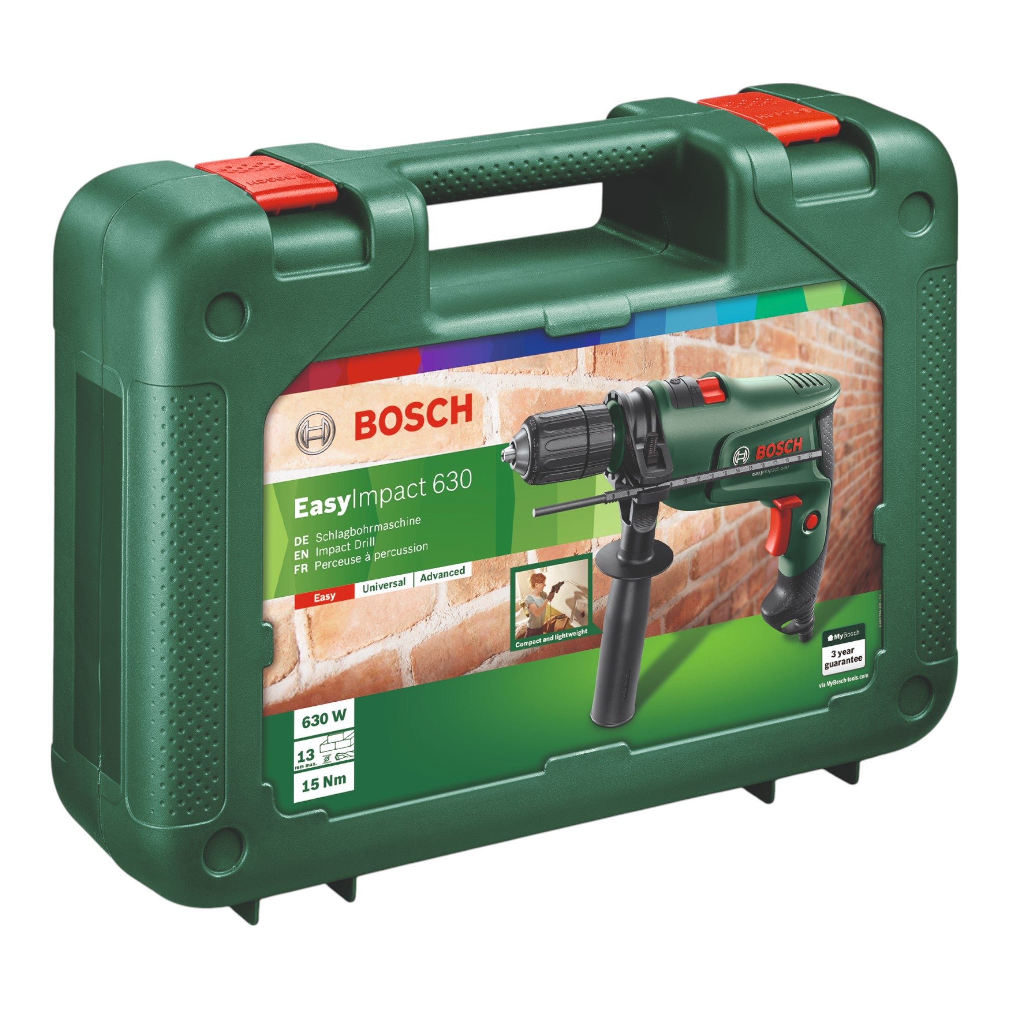 Bosch EasyImpact 630 to wiertarka udarowa o mocy 630 W i maksymalnym momencie obrotowym 15 Nm. Nadaje się do wygodnego i łatwego wiercenia w różnych materiałach. Wyposażona w szybkomocujący uchwyt wiertarski z automatyczną blokadą, umożliwia szybką i łatwą wymianę akcesoriów. Elektroniczny regulator prędkości Bosch umożliwia płynną regulację prędkości obrotowej za pomocą przełącznika przepustnicy. Ważąca zaledwie 1,7 kg wiertarko-wkrętarka jest kompaktowa, ergonomicznie zaprojektowana i dzięki temu wyjątkowo łatwa w obsłudze. Może z łatwością wiercić otwory w murze do 13 milimetrów i w drewnie do 25 milimetrów.