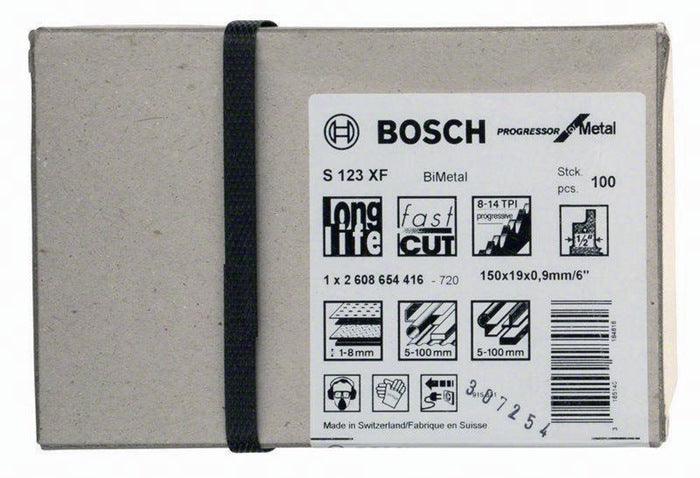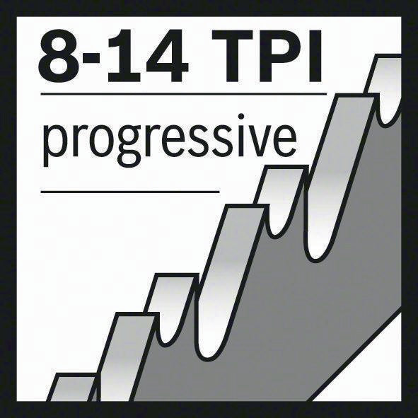 Progressor for Metal - konstrukcja zęba: zestaw - frezowany - stopniowo zwiększająca się podziałka zęba (1,8 - 3,2 mm) umożliwia szybkie cięcie w materiale o różnej gęstości - brzeszczot bimetalowy do cięcia rur stalowych i profili o normalnej grubości - specjalny kształt zęba do cięcia stali (1-8 mm) - wydajność cięcia 100 mm (standardowa długość brzeszczotu) - obszary zastosowań: Do cienkich i grubych blach (o grubości od 1 do 8 mm) - Do cienkich i grubych profili (o średnicy mniejszej niż 100 mm)