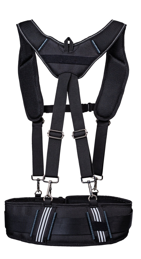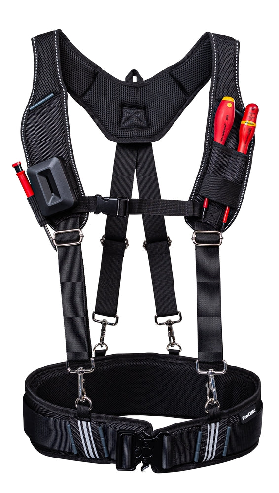 ProClick Suspenders S/M jest idealnym dodatkiem do pasów narzędziowych i oferuje wyściełany 4-punktowy system szelek. Dostępne w rozmiarze S/M, idealnie dopasowują się do każdego rozmiaru ciała dzięki bezstopniowo regulowanym paskom, gwarantując tym samym wysoki poziom komfortu i optymalne rozłożenie obciążenia. Wyposażone w praktyczne kieszenie, pętle na długopisy i pętlę na pasek do mocowania uchwytu ProClick, szelki te zapewniają efektywną organizację narzędzi. Cztery karabinki zapewniają również bezpieczne połączenie z pasem narzędziowym ProClick. Długość wyściółki wynosi 420 mm.