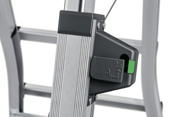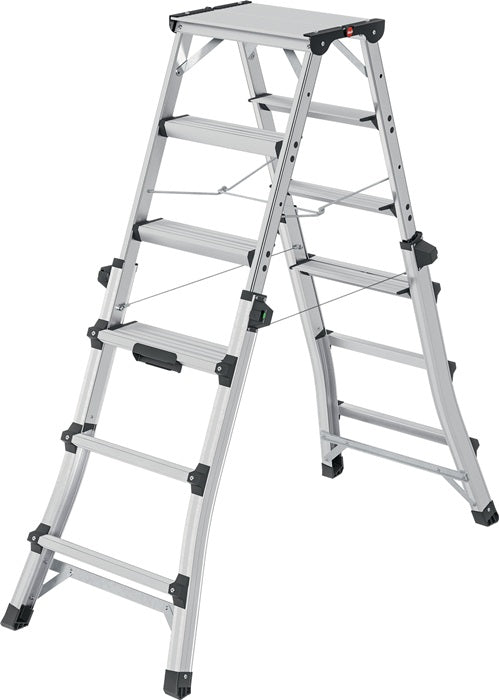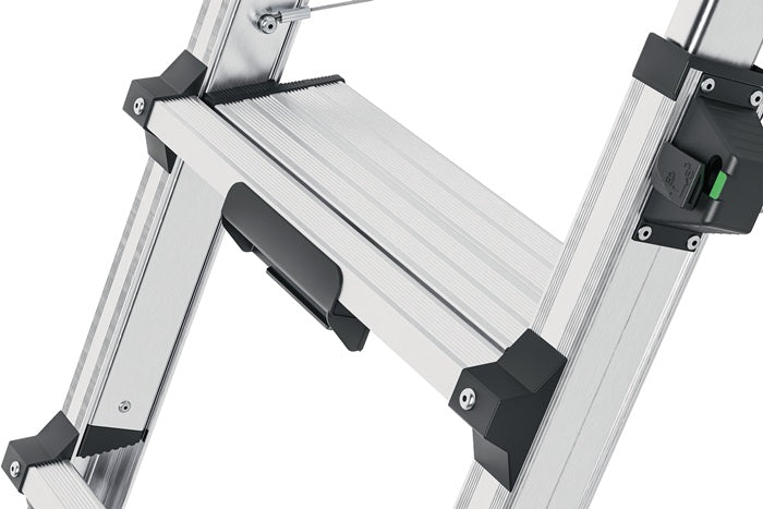 Aluminium - drabina teleskopowa zapewniająca elastyczną wysokość roboczą - stopnie wspinaczkowe i podporowe regulowane do 2 x 4, 2 x 5 lub 2 x 6 stopni - dostęp z obu stron - połączenie stopnia/szczebla z antypoślizgową, żebrowaną powierzchnią bieżnika - może być używana na schodach, maks. regulacja stopnia 430 mm - oszczędność miejsca - maks. obciążenie całkowite 150 kg